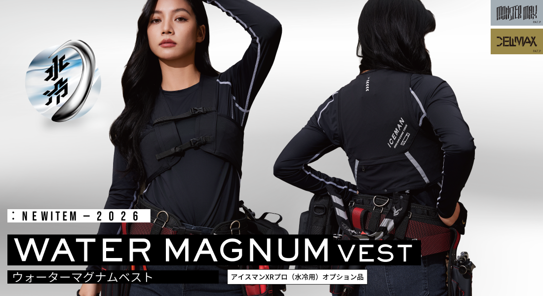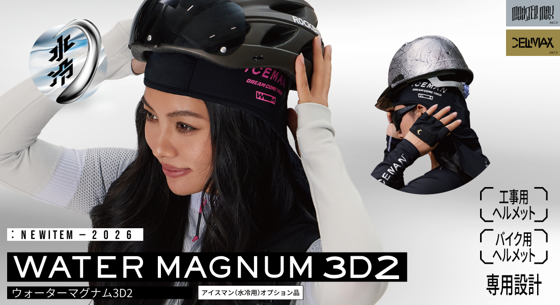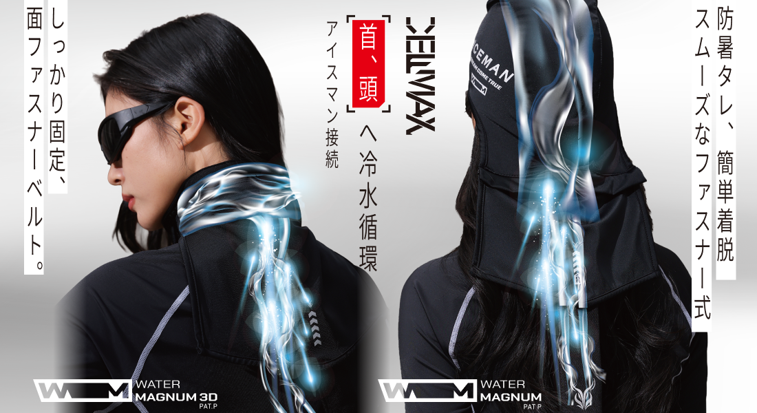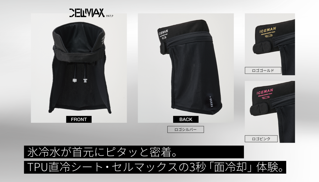 アイスマンの冷水を広範囲に伝えるTPU素材の水路冷却シートを開発。2層のメッシュ内部に水路冷却シートを挿入することにより、結露や汗も生地が吸収し快適に使用する事ができます。面で冷やすのでしっかり冷たさを体感できます。